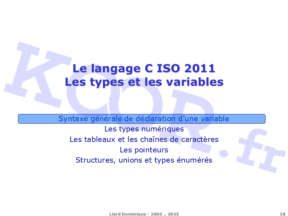 <h1>2011 - Les types et les variables</h1> <p>Syntaxe générale de déclaration d'une variable Les types numériques Les tableaux et les chaînes de caractères Les pointeurs Structures, unions et types énumérés</p> <p>Liard Dominique - 2005 .. 2025</p>