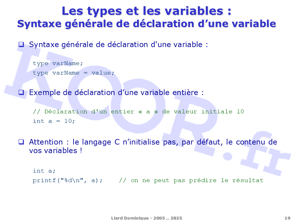 <h1>Les types et les variables - Syntaxe générale de déclaration d'une variable</h1> <p>Syntaxe générale de déclaration d'une variable : type varName; type varName = value; Exemple de déclaration d'une variable entière : // Déclaration d'un entier « a » de valeur initiale 10 int a = 10; Attention : le langage C n'initialise pas, par défaut, le contenu de vos variables ! int a; printf("%d\n", a); // on ne peut pas prédire le résultat</p> <p>Liard Dominique - 2005 .. 2025</p>