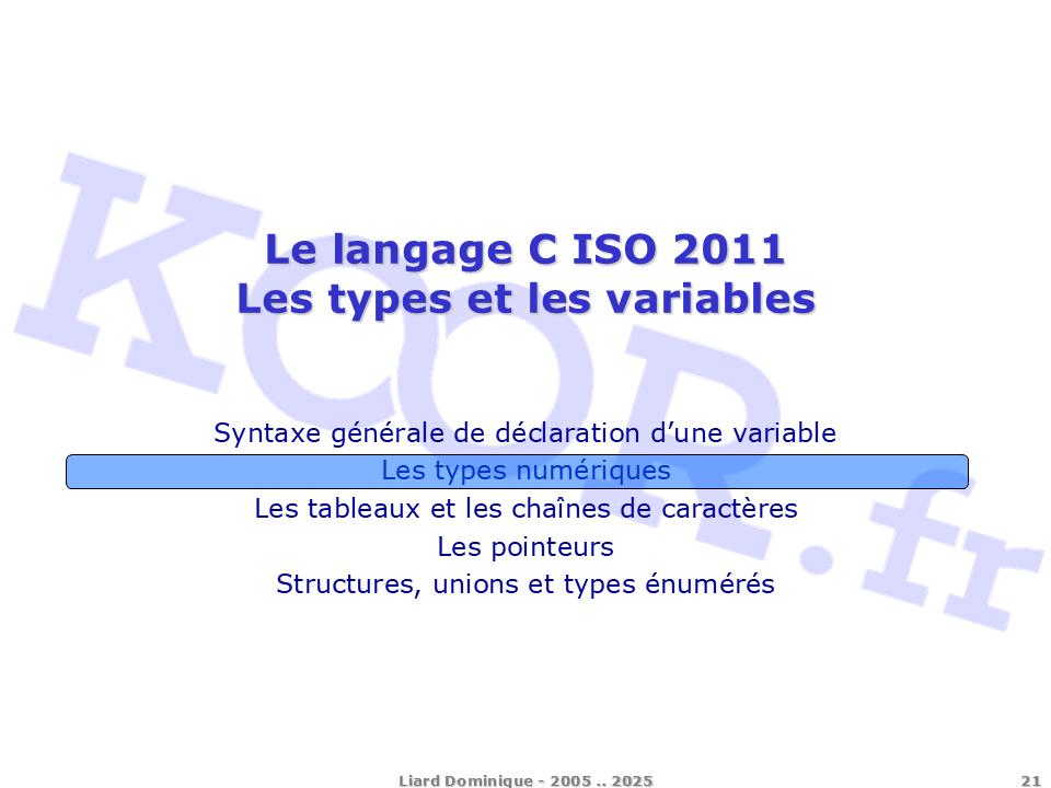 <h1>2011 - Les types et les variables</h1> <p>Syntaxe générale de déclaration d'une variable Les types numériques Les tableaux et les chaînes de caractères Les pointeurs Structures, unions et types énumérés</p> <p>Liard Dominique - 2005 .. 2025</p>