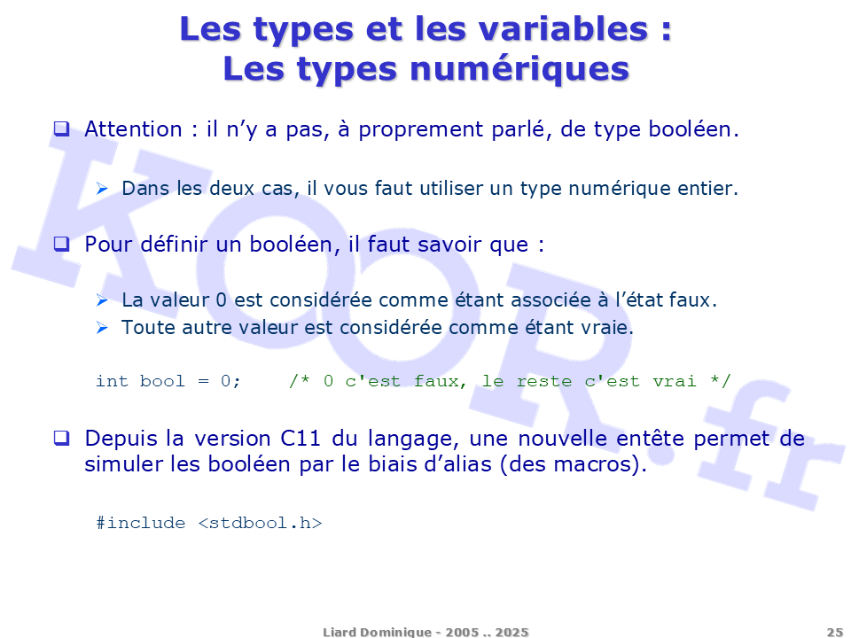 <h1>Les types et les variables - Les types numériques</h1> <p>Attention : il n'y a pas, à proprement parlé, de type booléen. Dans les deux cas, il vous faut utiliser un type numérique entier. Pour définir un booléen, il faut savoir que : La valeur 0 est considérée comme étant associée à l'état faux. Toute autre valeur est considérée comme étant vraie. int bool = 0; /* 0 c'est faux, le reste c'est vrai */ Depuis la version C11 du langage, une nouvelle entête permet de simuler les booléen par le biais d'alias (des macros). #include <stdbool.h></p> <p>Liard Dominique - 2005 .. 2025</p>