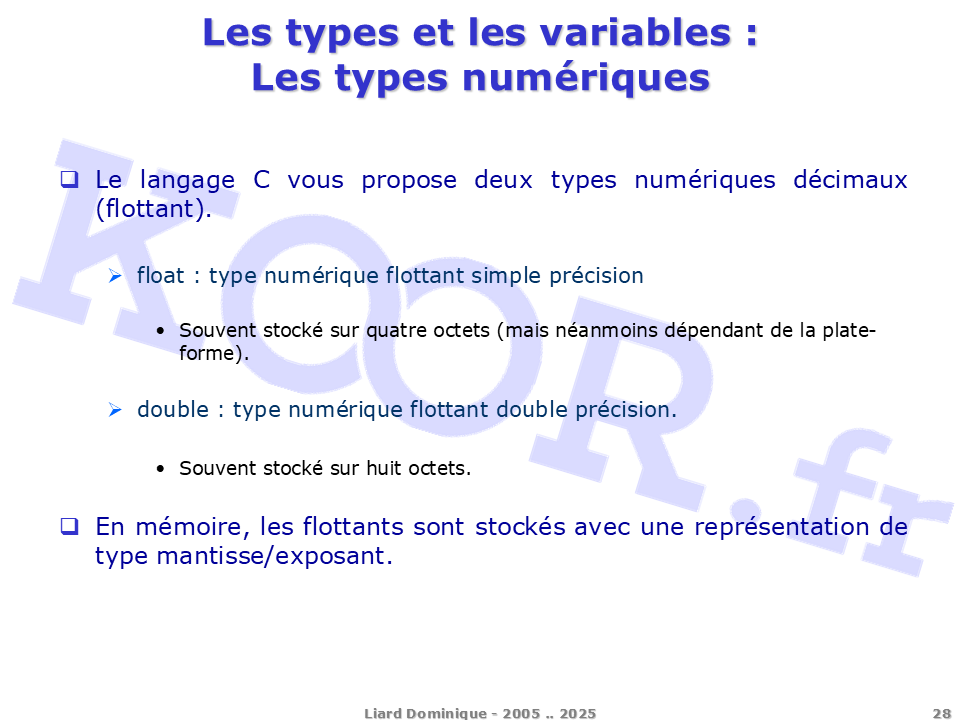 <h1>Les types et les variables - Les types numériques</h1> <p>Le langage C vous propose deux types numériques décimaux (flottant). float : type numérique flottant simple précision Souvent stocké sur quatre octets (mais néanmoins dépendant de la plate-forme). double : type numérique flottant double précision. Souvent stocké sur huit octets. En mémoire, les flottants sont stockés avec une représentation de type mantisse/exposant.</p> <p>Liard Dominique - 2005 .. 2025</p>