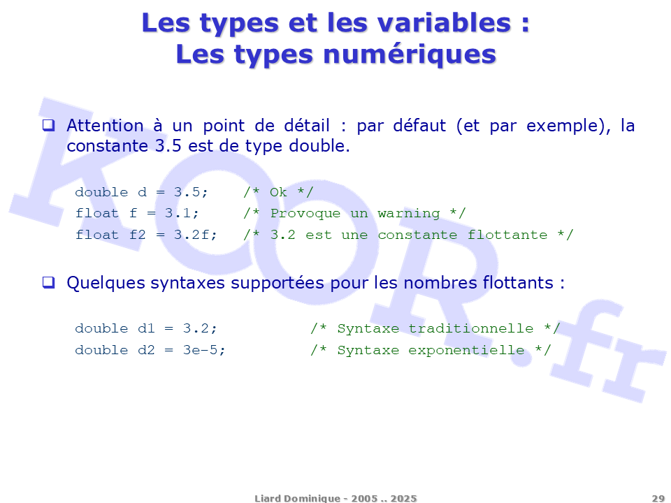 <h1>Les types et les variables - Les types numériques</h1> <p>Attention à un point de détail : par défaut (et par exemple), la constante 3.5 est de type double. double d = 3.5; /* Ok */ float f = 3.1; /* Provoque un warning */ float f2 = 3.2f; /* 3.2 est une constante flottante */ Quelques syntaxes supportées pour les nombres flottants : double d1 = 3.2; /* Syntaxe traditionnelle */ double d2 = 3e-5; /* Syntaxe exponentielle */</p> <p>Liard Dominique - 2005 .. 2025</p>