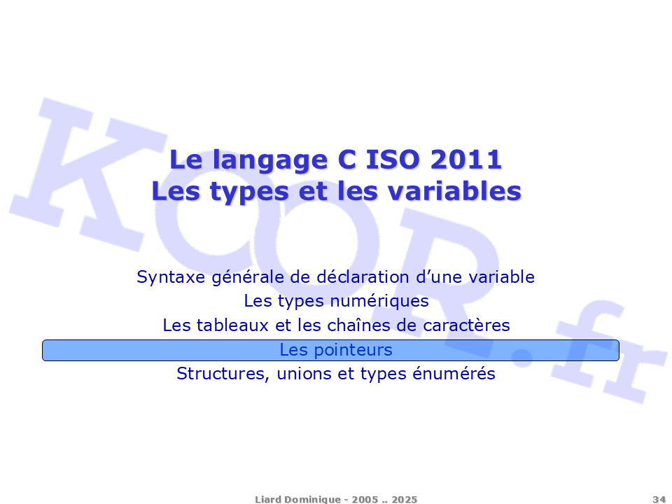 <h1>2011 - Les types et les variables</h1> <p>Syntaxe générale de déclaration d'une variable Les types numériques Les tableaux et les chaînes de caractères Les pointeurs Structures, unions et types énumérés</p> <p>Liard Dominique - 2005 .. 2025</p>
