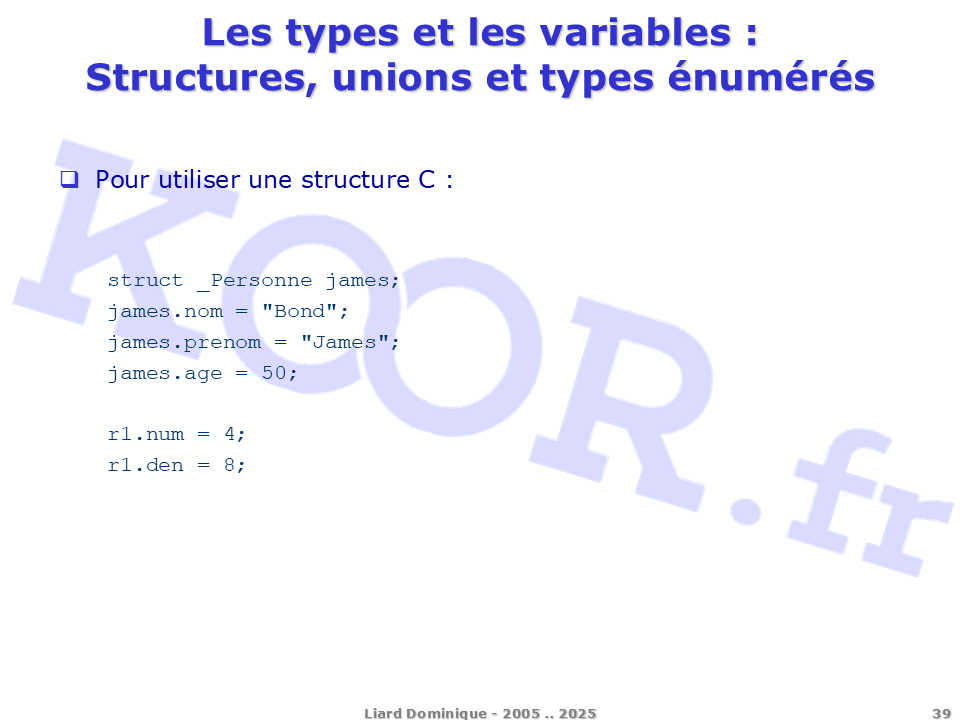 <h1>Les types et les variables - Structures, unions et types énumérés</h1> <p>Pour utiliser une structure C : struct _Personne james; james.nom = "Bond"; james.prenom = "James"; james.age = 50; r1.num = 4; r1.den = 8;</p> <p>Liard Dominique - 2005 .. 2025</p>