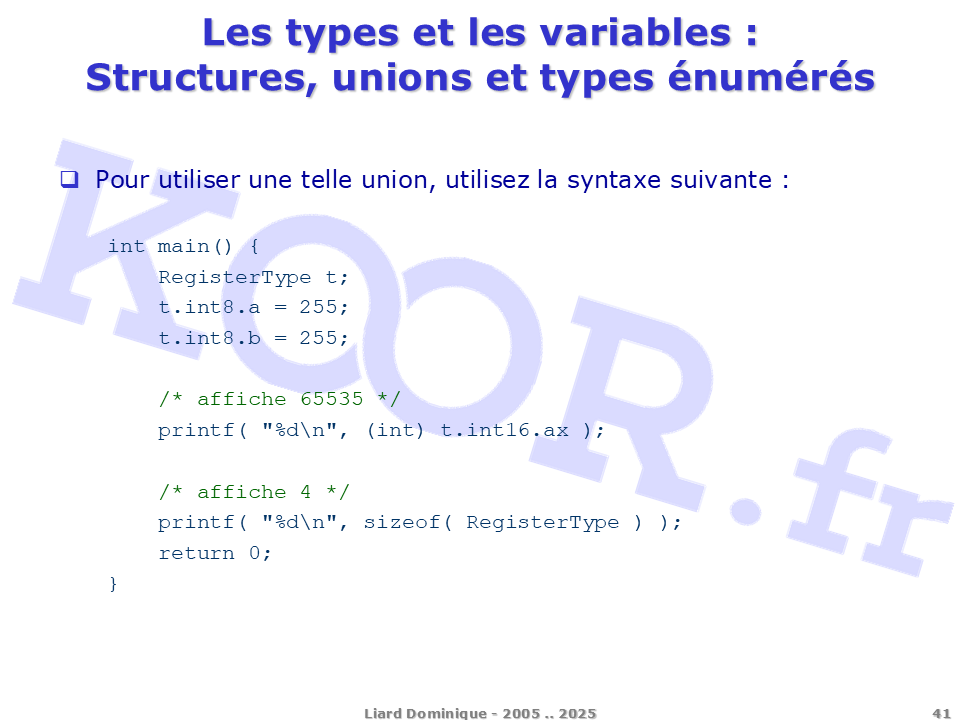 <h1>Les types et les variables - Structures, unions et types énumérés</h1> <p>Pour utiliser une telle union, utilisez la syntaxe suivante : int main() { RegisterType t; t.int8.a = 255; t.int8.b = 255; /* affiche 65535 */ printf( "%d\n", (int) t.int16.ax ); /* affiche 4 */ printf( "%d\n", sizeof( RegisterType ) ); return 0; }</p> <p>Liard Dominique - 2005 .. 2025</p>