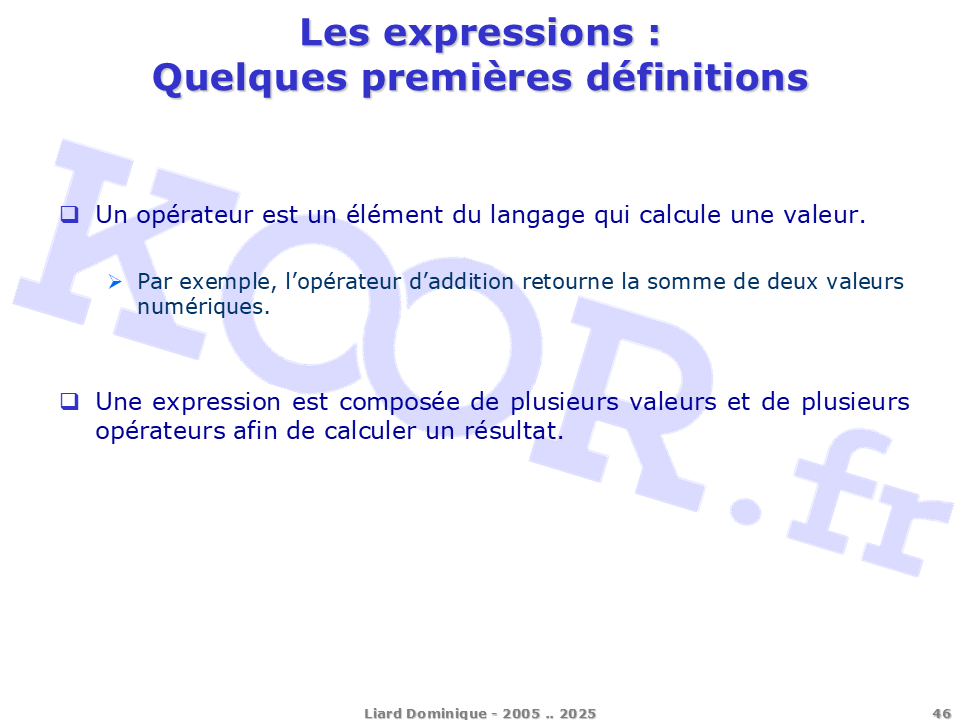 <h1>Les expressions - Quelques premières définitions</h1> <p>Un opérateur est un élément du langage qui calcule une valeur. Par exemple, l'opérateur d'addition retourne la somme de deux valeurs numériques. Une expression est composée de plusieurs valeurs et de plusieurs opérateurs afin de calculer un résultat.</p> <p>Liard Dominique - 2005 .. 2025</p>