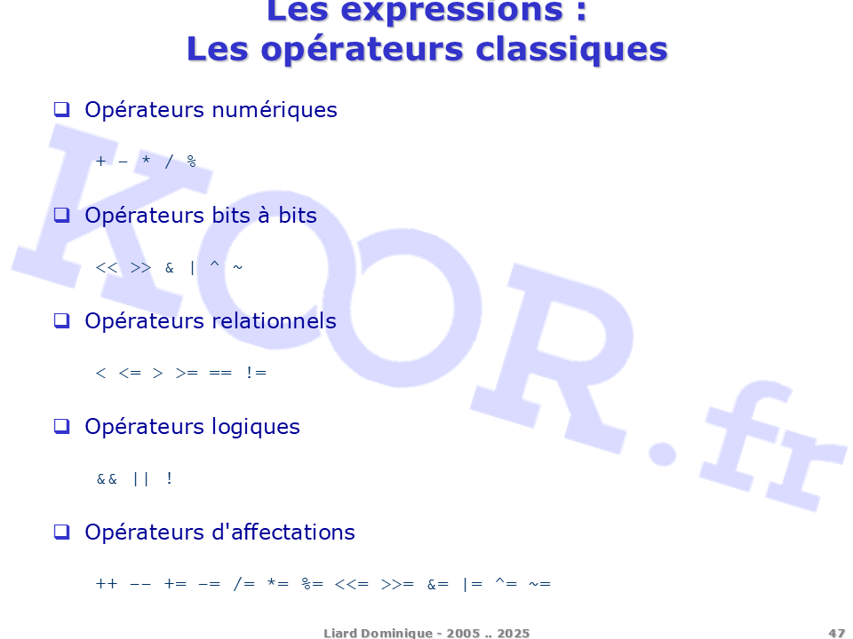 <h1>Les expressions - Les opérateurs classiques</h1> <p>Opérateurs numériques + - * / % Opérateurs bits à bits << >> & | ^ ~ Opérateurs relationnels < <= > >= == != Opérateurs logiques && || ! Opérateurs d'affectations ++ -- += -= /= *= %= <<= >>= &= |= ^= ~=</p> <p>Liard Dominique - 2005 .. 2025</p>