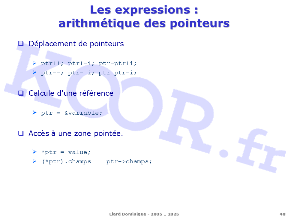 <h1>Les expressions - arithmétique des pointeurs</h1> <p>Déplacement de pointeurs ptr++; ptr+=i; ptr=ptr+i; ptr--; ptr-=i; ptr=ptr-i; Calcule d'une référence ptr = &variable; Accès à une zone pointée. *ptr = value; (*ptr).champs == ptr->champs;</p> <p>Liard Dominique - 2005 .. 2025</p>
