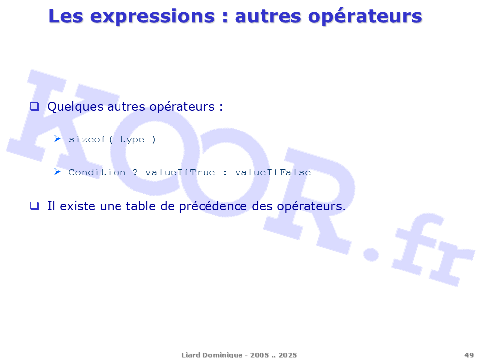 <h1>Les expressions - autres opérateurs</h1> <p>Quelques autres opérateurs : sizeof( type ) Condition ? valueIfTrue : valueIfFalse Il existe une table de précédence des opérateurs.</p> <p>Liard Dominique - 2005 .. 2025</p>