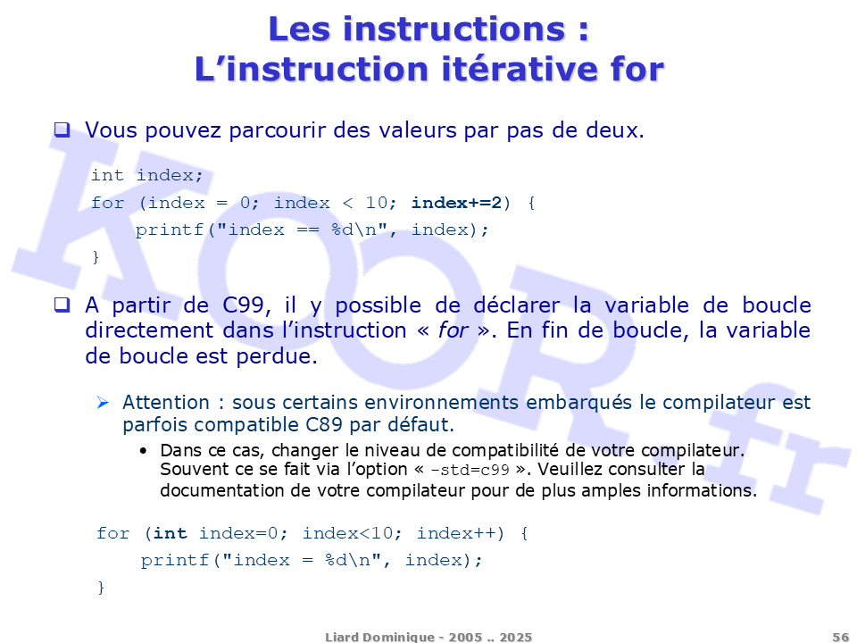 <h1>Les instructions - L'instruction itérative for</h1> <p>Vous pouvez parcourir des valeurs par pas de deux. int index; for (index = 0; index < 10; index+=2) { printf("index == %d\n", index); } A partir de C99, il y possible de déclarer la variable de boucle directement dans l'instruction « for ». En fin de boucle, la variable de boucle est perdue. Attention : sous certains environnements embarqués le compilateur est parfois compatible C89 par défaut. Dans ce cas, changer le niveau de compatibilité de votre compilateur. Souvent ce se fait via l'option « -std=c99 ». Veuillez consulter la documentation de votre compilateur pour de plus amples informations. for (int index=0; index<10; index++) { printf("index = %d\n", index); }</p> <p>Liard Dominique - 2005 .. 2025</p>