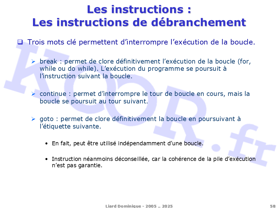 <h1>Les instructions - Les instructions de débranchement</h1> <p>Trois mots clé permettent d'interrompre l'exécution de la boucle. break : permet de clore définitivement l'exécution de la boucle (for, while ou do while). L'exécution du programme se poursuit à l'instruction suivant la boucle. continue : permet d'interrompre le tour de boucle en cours, mais la boucle se poursuit au tour suivant. goto : permet de clore définitivement la boucle en poursuivant à l'étiquette suivante. En fait, peut être utilisé indépendamment d'une boucle. Instruction néanmoins déconseillée, car la cohérence de la pile d'exécution n'est pas garantie.</p> <p>Liard Dominique - 2005 .. 2025</p>
