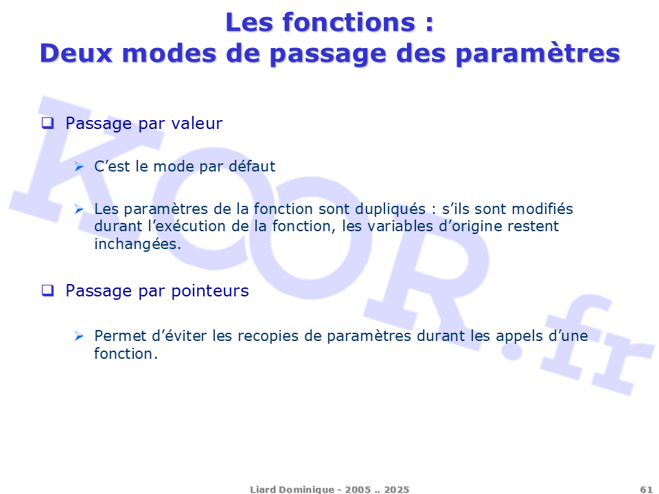 <h1>Les fonctions - Deux modes de passage des paramètres</h1> <p>Passage par valeur C'est le mode par défaut Les paramètres de la fonction sont dupliqués : s'ils sont modifiés durant l'exécution de la fonction, les variables d'origine restent inchangées. Passage par pointeurs Permet d'éviter les recopies de paramètres durant les appels d'une fonction.</p> <p>Liard Dominique - 2005 .. 2025</p>