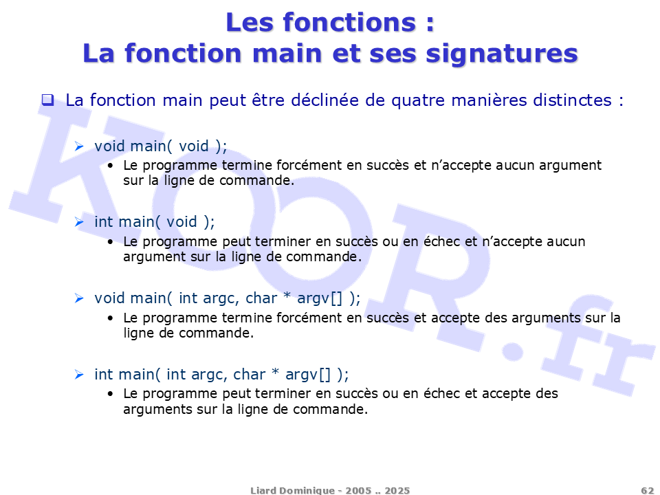 <h1>Les fonctions - La fonction main et ses signatures</h1> <p>La fonction main peut être déclinée de quatre manières distinctes : void main( void ); Le programme termine forcément en succès et n'accepte aucun argument sur la ligne de commande. int main( void ); Le programme peut terminer en succès ou en échec et n'accepte aucun argument sur la ligne de commande. void main( int argc, char * argv[] ); Le programme termine forcément en succès et accepte des arguments sur la ligne de commande. int main( int argc, char * argv[] ); Le programme peut terminer en succès ou en échec et accepte des arguments sur la ligne de commande.</p> <p>Liard Dominique - 2005 .. 2025</p>