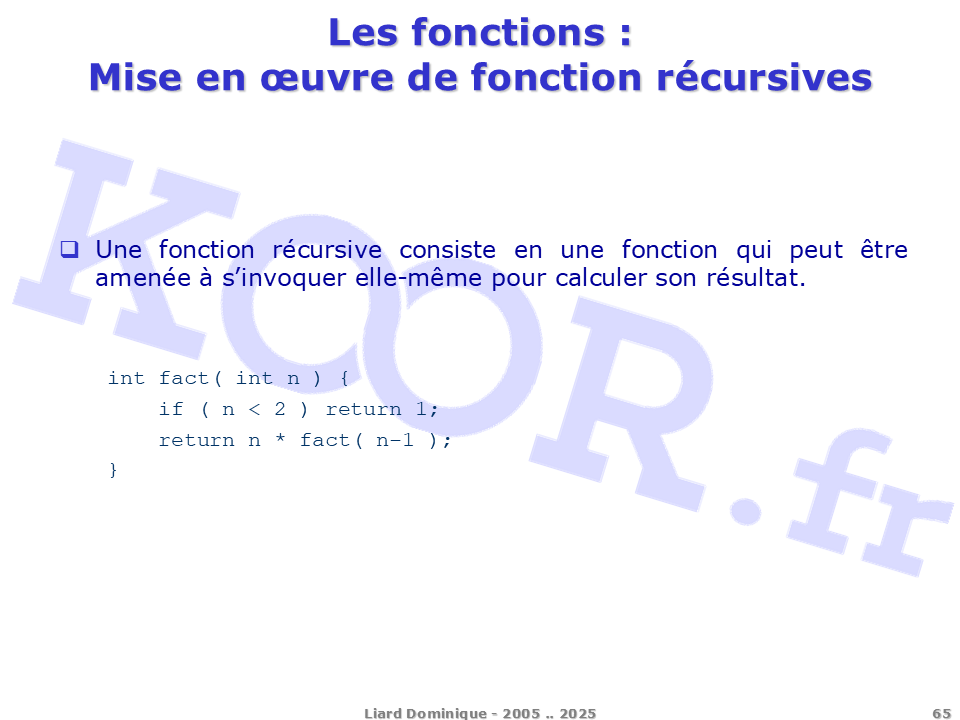 <h1>Les fonctions - Mise en oeuvre de fonction récursives</h1> <p>Une fonction récursive consiste en une fonction qui peut être amenée à s'invoquer elle-même pour calculer son résultat. int fact( int n ) { if ( n < 2 ) return 1; return n * fact( n-1 ); }</p> <p>Liard Dominique - 2005 .. 2025</p>