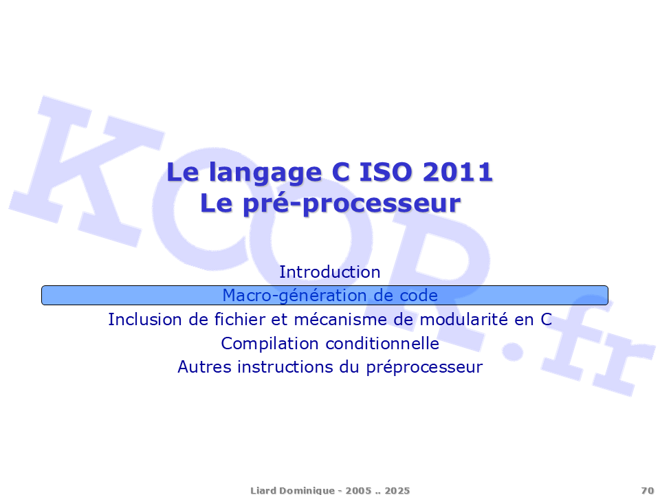 <h1>2011 - Le pré-processeur</h1> <p>Introduction Macro-génération de code Inclusion de fichier et mécanisme de modularité en C Compilation conditionnelle Autres instructions du préprocesseur</p> <p>Liard Dominique - 2005 .. 2025</p>