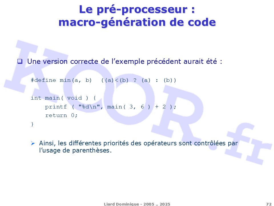 <h1>Le pré-processeur - macro-génération de code</h1> <p>Une version correcte de l'exemple précédent aurait été : #define min(a, b) ((a)<(b) ? (a) : (b)) int main( void ) { printf ( "%d\n", main( 3, 6 ) + 2 ); return 0; } Ainsi, les différentes priorités des opérateurs sont contrôlées par l'usage de parenthèses.</p> <p>Liard Dominique - 2005 .. 2025</p>