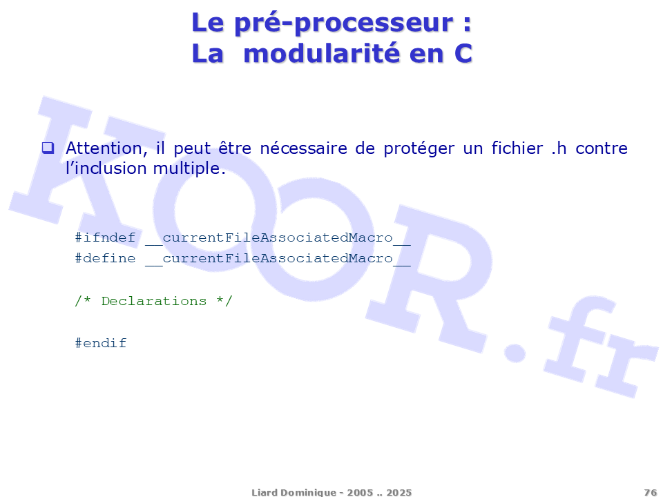 <h1>Le pré-processeur - La modularité en C</h1> <p>Attention, il peut être nécessaire de protéger un fichier .h contre l'inclusion multiple. #ifndef __currentFileAssociatedMacro__ #define __currentFileAssociatedMacro__ /* Declarations */ #endif</p> <p>Liard Dominique - 2005 .. 2025</p>