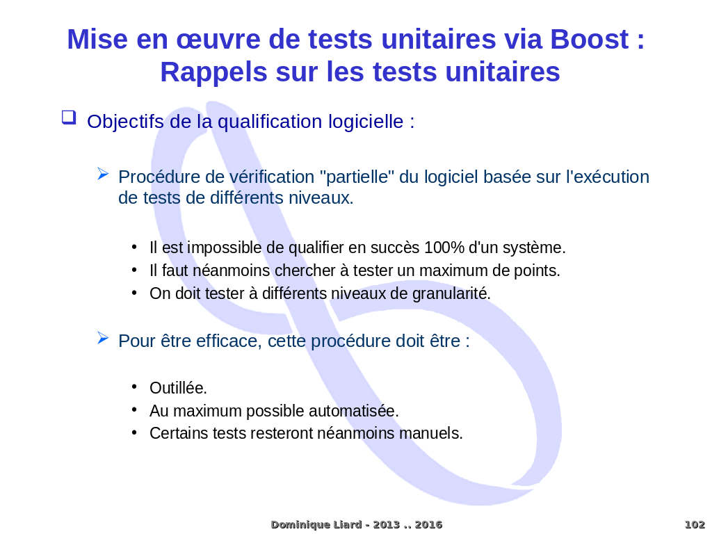 Mise en ?uvre de tests unitaires via Boost : Rappels sur les tests unitaires Objectifs de la qualification logicielle : Procédure de vérification "partielle" du logiciel basée sur l'exécution de tests de différents niveaux. Il est impossible de qualifier en succès 100% d'un système. Il faut néanmoins chercher à tester un maximum de points. On doit tester à différents niveaux de granularité. Pour être efficace, cette procédure doit être : Outillée. Au maximum possible automatisée. Certains tests resteront néanmoins manuels. Dominique Liard - 2013 .. 2016