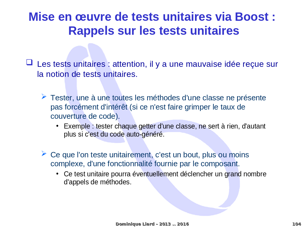 Mise en ?uvre de tests unitaires via Boost : Rappels sur les tests unitaires Les tests unitaires : attention, il y a une mauvaise idée reçue sur la notion de tests unitaires. Tester, une à une toutes les méthodes d'une classe ne présente pas forcément d'intérêt (si ce n'est faire grimper le taux de couverture de code). Exemple : tester chaque getter d'une classe, ne sert à rien, d'autant plus si c'est du code auto-généré. Ce que l'on teste unitairement, c'est un bout, plus ou moins complexe, d'une fonctionnalité fournie par le composant. Ce test unitaire pourra éventuellement déclencher un grand nombre d'appels de méthodes. Dominique Liard - 2013 .. 2016