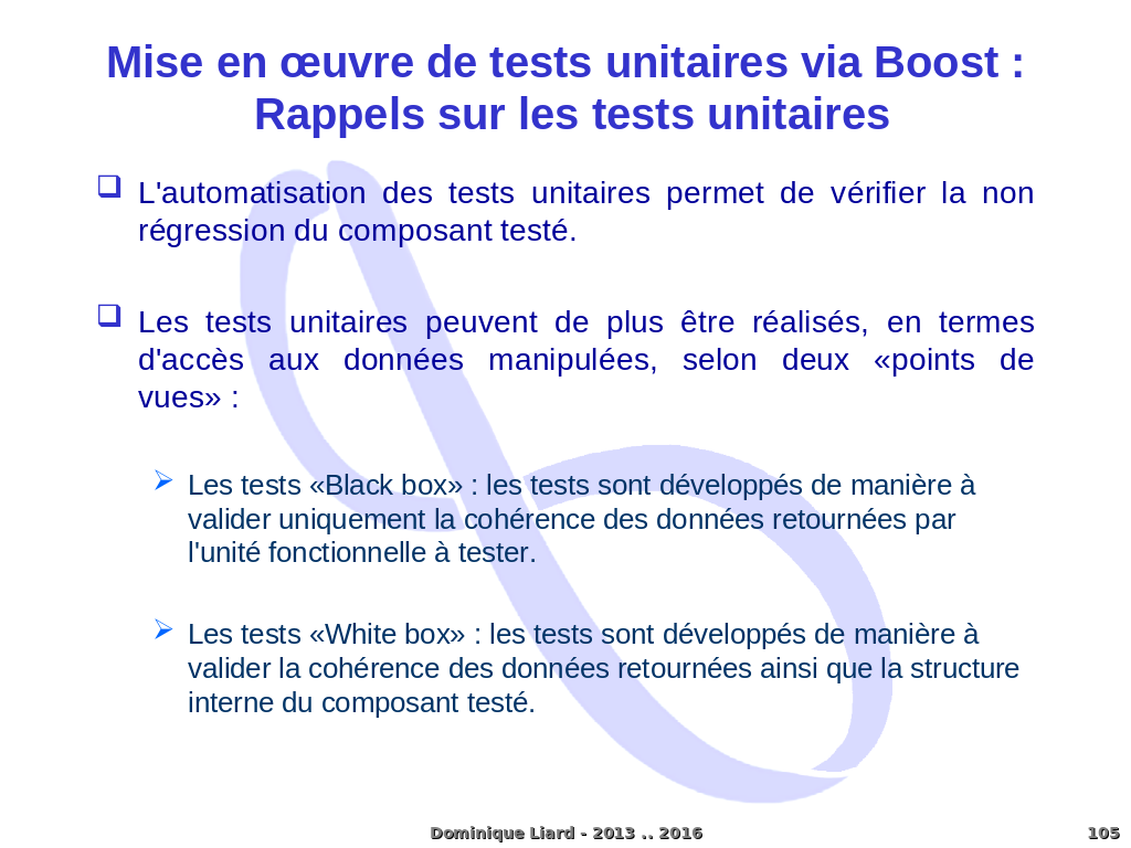 Mise en ?uvre de tests unitaires via Boost : Rappels sur les tests unitaires L'automatisation des tests unitaires permet de vérifier la non régression du composant testé. Les tests unitaires peuvent de plus être réalisés, en termes d'accès aux données manipulées, selon deux «points de vues» : Les tests «Black box» : les tests sont développés de manière à valider uniquement la cohérence des données retournées par l'unité fonctionnelle à tester. Les tests «White box» : les tests sont développés de manière à valider la cohérence des données retournées ainsi que la structure interne du composant testé. Dominique Liard - 2013 .. 2016
