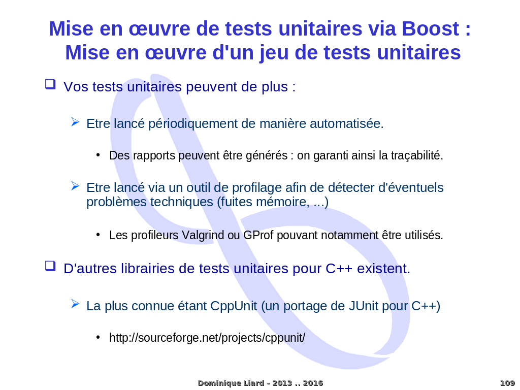 Mise en ?uvre de tests unitaires via Boost : Mise en ?uvre d'un jeu de tests unitaires Vos tests unitaires peuvent de plus : Etre lancé périodiquement de manière automatisée. Des rapports peuvent être générés : on garanti ainsi la traçabilité. Etre lancé via un outil de profilage afin de détecter d'éventuels problèmes techniques (fuites mémoire, ...) Les profileurs Valgrind ou GProf pouvant notamment être utilisés. D'autres librairies de tests unitaires pour C++ existent. La plus connue étant CppUnit (un portage de JUnit pour C++) http://sourceforge.net/projects/cppunit/ Dominique Liard - 2013 .. 2016