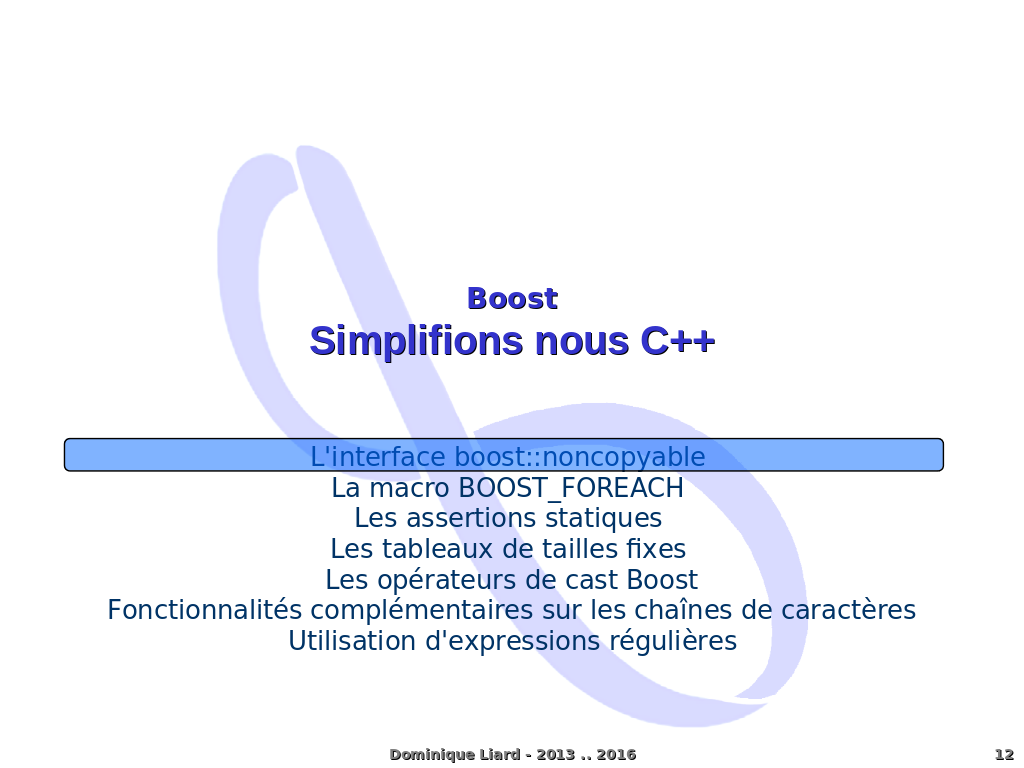 BoostSimplifions nous C++ L'interface boost::noncopyable La macro BOOST_FOREACH Les assertions statiques Les tableaux de tailles fixes Les opérateurs de cast Boost Fonctionnalités complémentaires sur les chaînes de caractères Utilisation d'expressions régulières Dominique Liard - 2013 .. 2016
