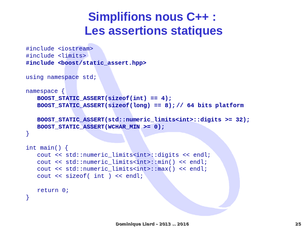 Simplifions nous C++ : Les assertions statiques #include <iostream> #include <limits> #include <boost/static_assert.hpp> using namespace std; namespace { BOOST_STATIC_ASSERT(sizeof(int) == 4); BOOST_STATIC_ASSERT(sizeof(long) == 8); // 64 bits platform BOOST_STATIC_ASSERT(std::numeric_limits<int>::digits >= 32); BOOST_STATIC_ASSERT(WCHAR_MIN >= 0); } int main() { cout << std::numeric_limits<int>::digits << endl; cout << std::numeric_limits<int>::min() << endl; cout << std::numeric_limits<int>::max() << endl; cout << sizeof( int ) << endl; return 0; } Dominique Liard - 2013 .. 2016