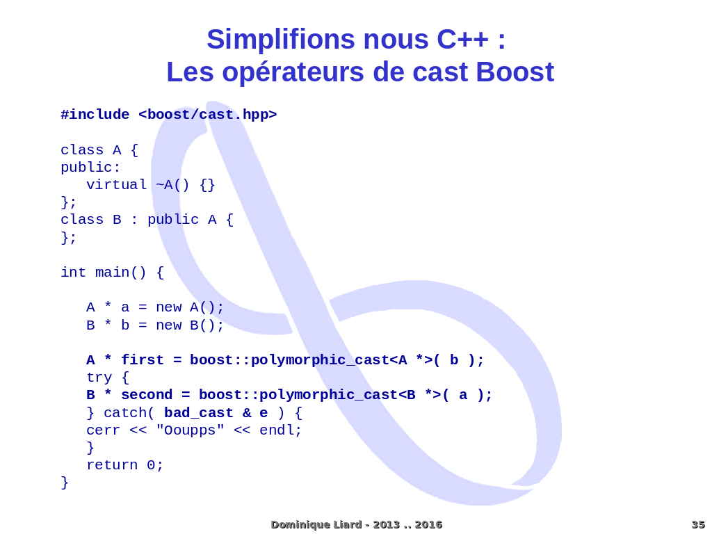 Simplifions nous C++ : Les opérateurs de cast Boost #include <boost/cast.hpp> class A { public: virtual ~A() {} }; class B : public A { }; int main() { A * a = new A(); B * b = new B(); A * first = boost::polymorphic_cast<A *>( b ); try { B * second = boost::polymorphic_cast<B *>( a ); } catch( bad_cast & e ) { cerr << "Ooupps" << endl; } return 0; } Dominique Liard - 2013 .. 2016