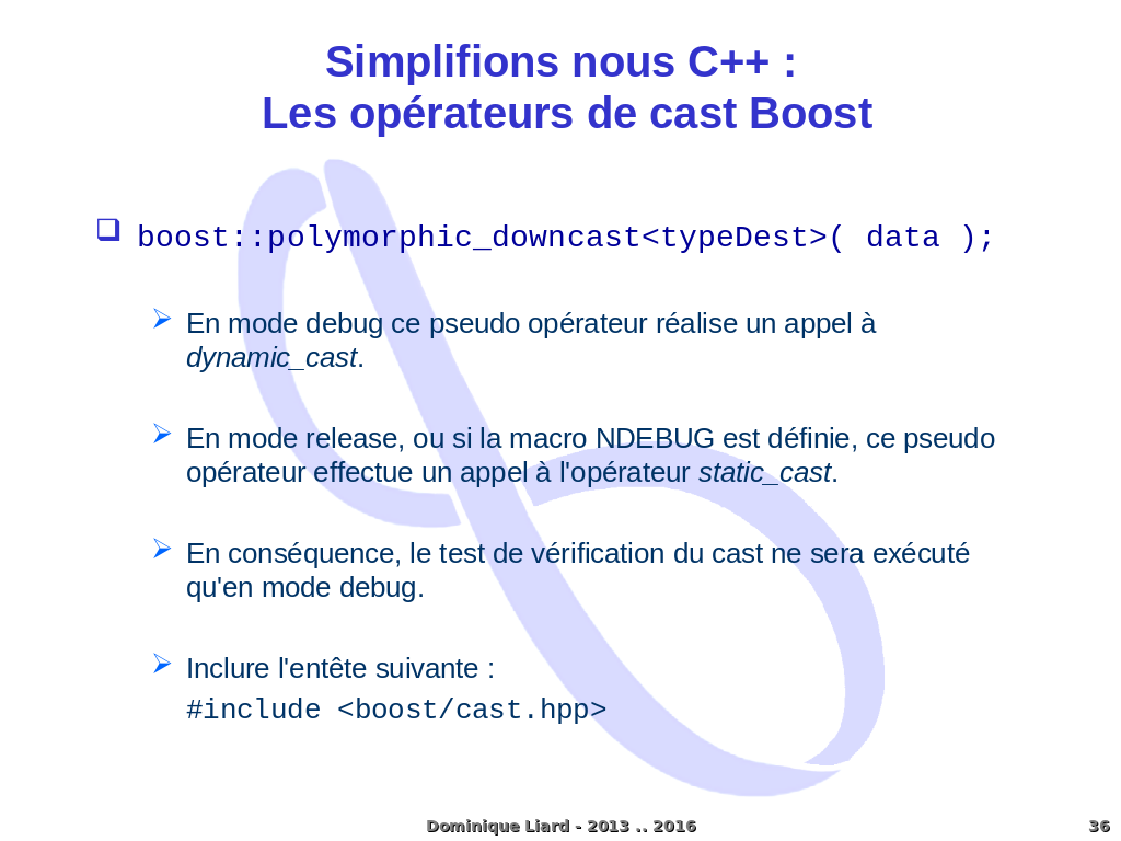 Simplifions nous C++ : Les opérateurs de cast Boost boost::polymorphic_downcast<typeDest>( data ); En mode debug ce pseudo opérateur réalise un appel à dynamic_cast. En mode release, ou si la macro NDEBUG est définie, ce pseudo opérateur effectue un appel à l'opérateur static_cast. En conséquence, le test de vérification du cast ne sera exécuté qu'en mode debug. Inclure l'entête suivante : #include <boost/cast.hpp> Dominique Liard - 2013 .. 2016