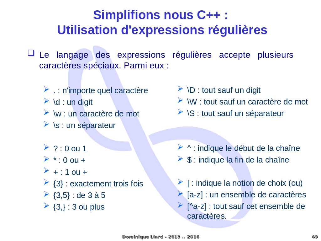 Simplifions nous C++ : Utilisation d'expressions régulières Le langage des expressions régulières accepte plusieurs caractères spéciaux. Parmi eux : . : n'importe quel caractère \d : un digit \w : un caractère de mot \s : un séparateur ? : 0 ou 1 * : 0 ou + + : 1 ou + {3} : exactement trois fois {3,5} : de 3 à 5 {3,} : 3 ou plus \D : tout sauf un digit \W : tout sauf un caractère de mot \S : tout sauf un séparateur ^ : indique le début de la chaîne $ : indique la fin de la chaîne | : indique la notion de choix (ou) [a-z] : un ensemble de caractères [^a-z] : tout sauf cet ensemble de caractères. Dominique Liard - 2013 .. 2016