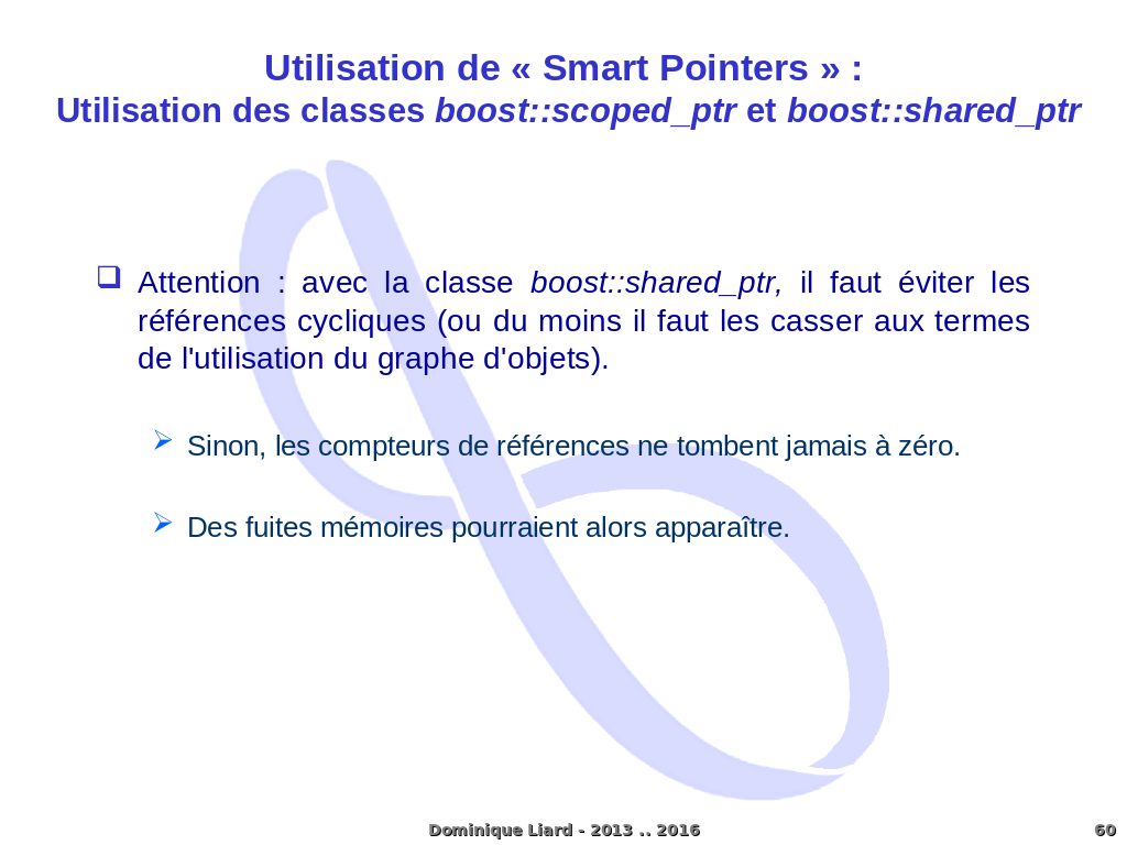 Utilisation de « Smart Pointers » : Utilisation des classes boost::scoped_ptr et boost::shared_ptr Attention : avec la classe boost::shared_ptr, il faut éviter les références cycliques (ou du moins il faut les casser aux termes de l'utilisation du graphe d'objets). Sinon, les compteurs de références ne tombent jamais à zéro. Des fuites mémoires pourraient alors apparaître. Dominique Liard - 2013 .. 2016