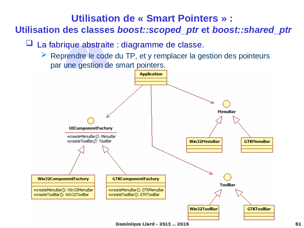 Utilisation de « Smart Pointers » : Utilisation des classes boost::scoped_ptr et boost::shared_ptr La fabrique abstraite : diagramme de classe. Reprendre le code du TP, et y remplacer la gestion des pointeurs par une gestion de smart pointers. Dominique Liard - 2013 .. 2016