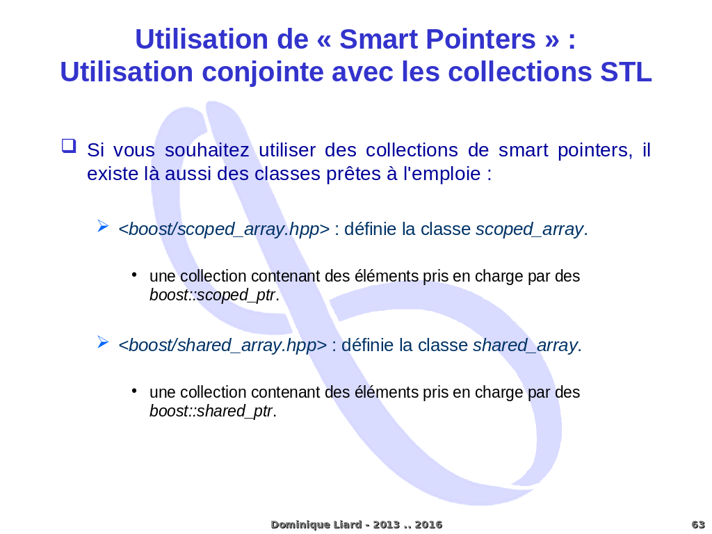 Utilisation de « Smart Pointers » :Utilisation conjointe avec les collections STL Si vous souhaitez utiliser des collections de smart pointers, il existe là aussi des classes prêtes à l'emploie : <boost/scoped_array.hpp> : définie la classe scoped_array. une collection contenant des éléments pris en charge par des boost::scoped_ptr. <boost/shared_array.hpp> : définie la classe shared_array. une collection contenant des éléments pris en charge par des boost::shared_ptr. Dominique Liard - 2013 .. 2016