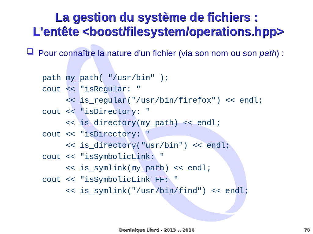 La gestion du système de fichiers : L'entête <boost/filesystem/operations.hpp> Pour connaître la nature d'un fichier (via son nom ou son path) : path my_path( "/usr/bin" ); cout << "isRegular: " << is_regular("/usr/bin/firefox") << endl; cout << "isDirectory: " << is_directory(my_path) << endl; cout << "isDirectory: " << is_directory("usr/bin") << endl; cout << "isSymbolicLink: " << is_symlink(my_path) << endl; cout << "isSymbolicLink FF: " << is_symlink("/usr/bin/find") << endl; Dominique Liard - 2013 .. 2016