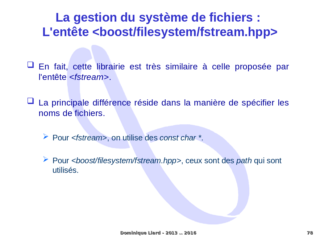 La gestion du système de fichiers : L'entête <boost/filesystem/fstream.hpp> En fait, cette librairie est très similaire à celle proposée par l'entête <fstream>. La principale différence réside dans la manière de spécifier les noms de fichiers. Pour <fstream>, on utilise des const char *. Pour <boost/filesystem/fstream.hpp>, ceux sont des path qui sont utilisés. Dominique Liard - 2013 .. 2016