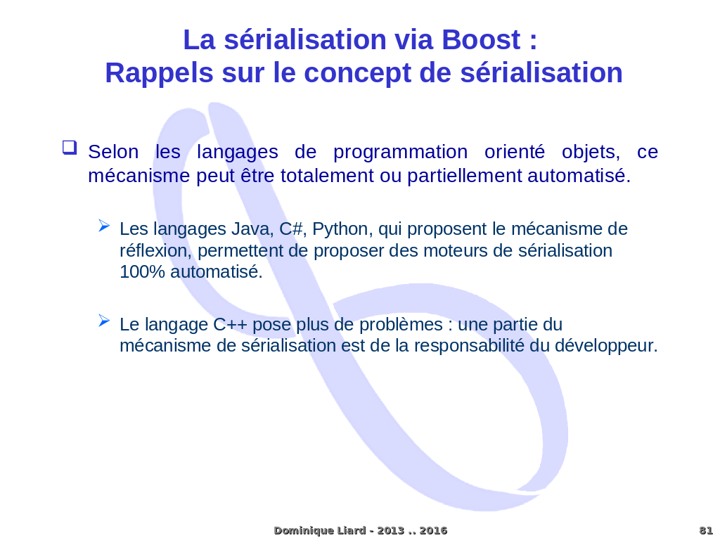 La sérialisation via Boost : Rappels sur le concept de sérialisation Selon les langages de programmation orienté objets, ce mécanisme peut être totalement ou partiellement automatisé. Les langages Java, C#, Python, qui proposent le mécanisme de réflexion, permettent de proposer des moteurs de sérialisation 100% automatisé. Le langage C++ pose plus de problèmes : une partie du mécanisme de sérialisation est de la responsabilité du développeur. Dominique Liard - 2013 .. 2016