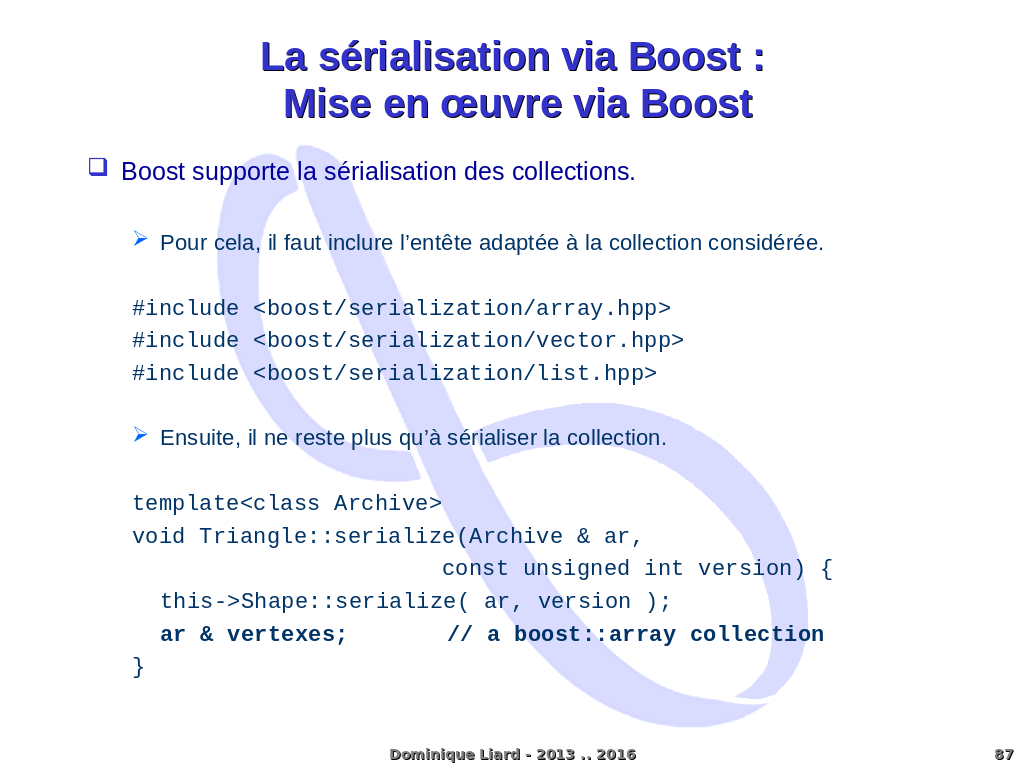 La sérialisation via Boost : Mise en ?uvre via Boost Boost supporte la sérialisation des collections. Pour cela, il faut inclure l?entête adaptée à la collection considérée. #include <boost/serialization/array.hpp> #include <boost/serialization/vector.hpp> #include <boost/serialization/list.hpp> Ensuite, il ne reste plus qu?à sérialiser la collection. template<class Archive> void Triangle::serialize(Archive & ar, const unsigned int version) { this->Shape::serialize( ar, version ); ar & vertexes; // a boost::array collection } Dominique Liard - 2013 .. 2016