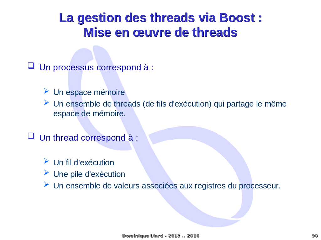 La gestion des threads via Boost :Mise en ?uvre de threads Un processus correspond à : Un espace mémoire Un ensemble de threads (de fils d'exécution) qui partage le même espace de mémoire. Un thread correspond à : Un fil d'exécution Une pile d'exécution Un ensemble de valeurs associées aux registres du processeur. Dominique Liard - 2013 .. 2016