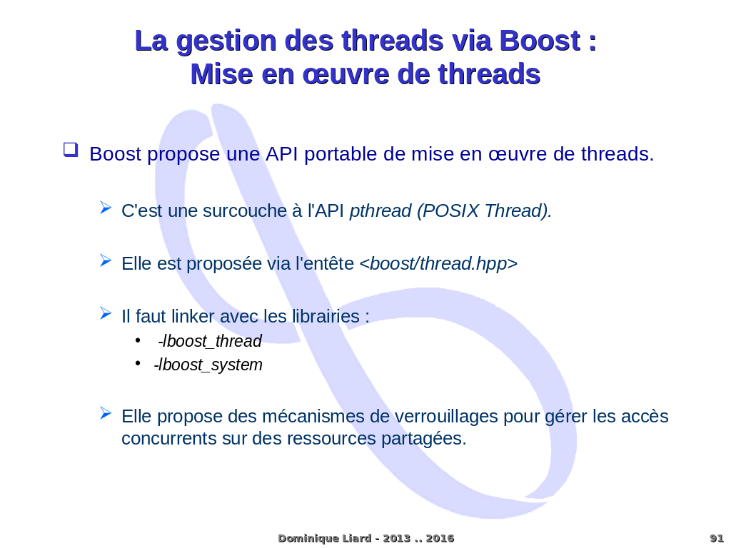 La gestion des threads via Boost :Mise en ?uvre de threads Boost propose une API portable de mise en ?uvre de threads. C'est une surcouche à l'API pthread (POSIX Thread). Elle est proposée via l'entête <boost/thread.hpp> Il faut linker avec les librairies : -lboost_thread -lboost_system Elle propose des mécanismes de verrouillages pour gérer les accès concurrents sur des ressources partagées. Dominique Liard - 2013 .. 2016