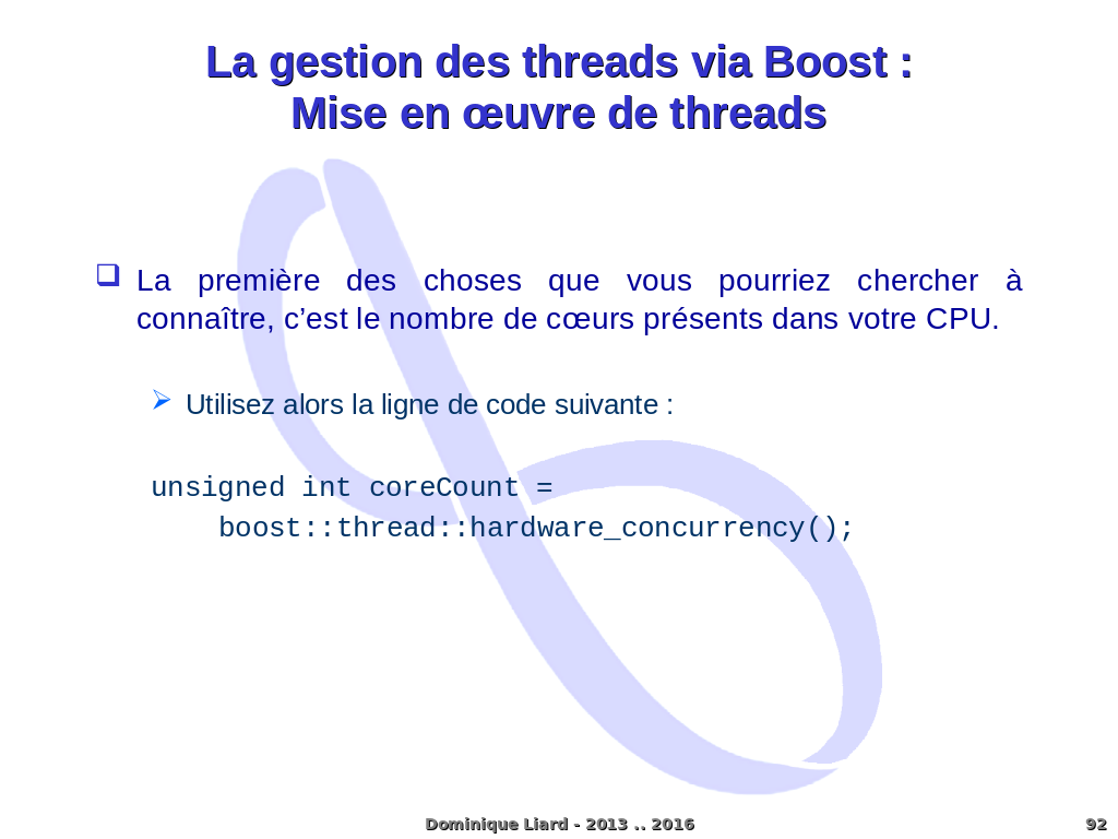 La gestion des threads via Boost :Mise en ?uvre de threads La première des choses que vous pourriez chercher à connaître, c?est le nombre de c?urs présents dans votre CPU. Utilisez alors la ligne de code suivante : unsigned int coreCount = boost::thread::hardware_concurrency(); Dominique Liard - 2013 .. 2016