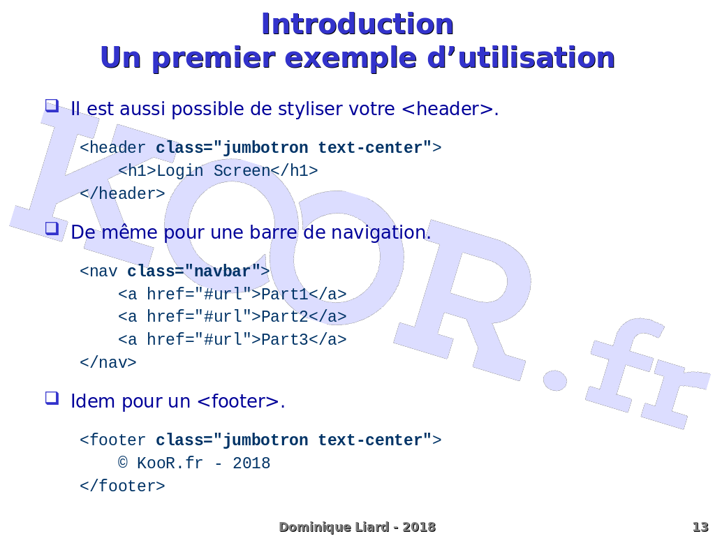 IntroductionUn premier exemple d?utilisation Il est aussi possible de styliser votre <header>. <header class="jumbotron text-center"> <h1>Login Screen</h1> </header> De même pour une barre de navigation. <nav class="navbar"> <a href="#url">Part1</a> <a href="#url">Part2</a> <a href="#url">Part3</a> </nav> Idem pour un <footer>. <footer class="jumbotron text-center"> © KooR.fr - 2018 </footer>