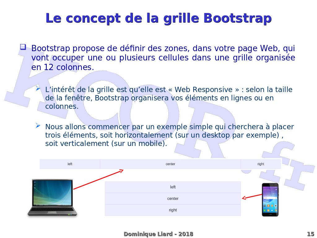 L?intérêt de la grille est qu?elle est « Web Responsive » : selon la taille de la fenêtre, Bootstrap organisera vos éléments en lignes ou en colonnes.