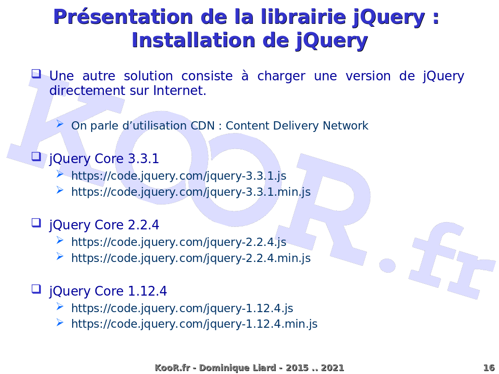 Présentation de la librairie jQuery : Installation de jQuery Une autre solution consiste à charger une version de jQuery directement sur Internet. On parle d'utilisation CDN : Content Delivery Network jQuery Core 3.3.1 https://code.jquery.com/jquery-3.3.1.js https://code.jquery.com/jquery-3.3.1.min.js jQuery Core 2.2.4 https://code.jquery.com/jquery-2.2.4.js https://code.jquery.com/jquery-2.2.4.min.js jQuery Core 1.12.4 https://code.jquery.com/jquery-1.12.4.js https://code.jquery.com/jquery-1.12.4.min.js KooR.fr - Dominique Liard - 2015 .. 2021