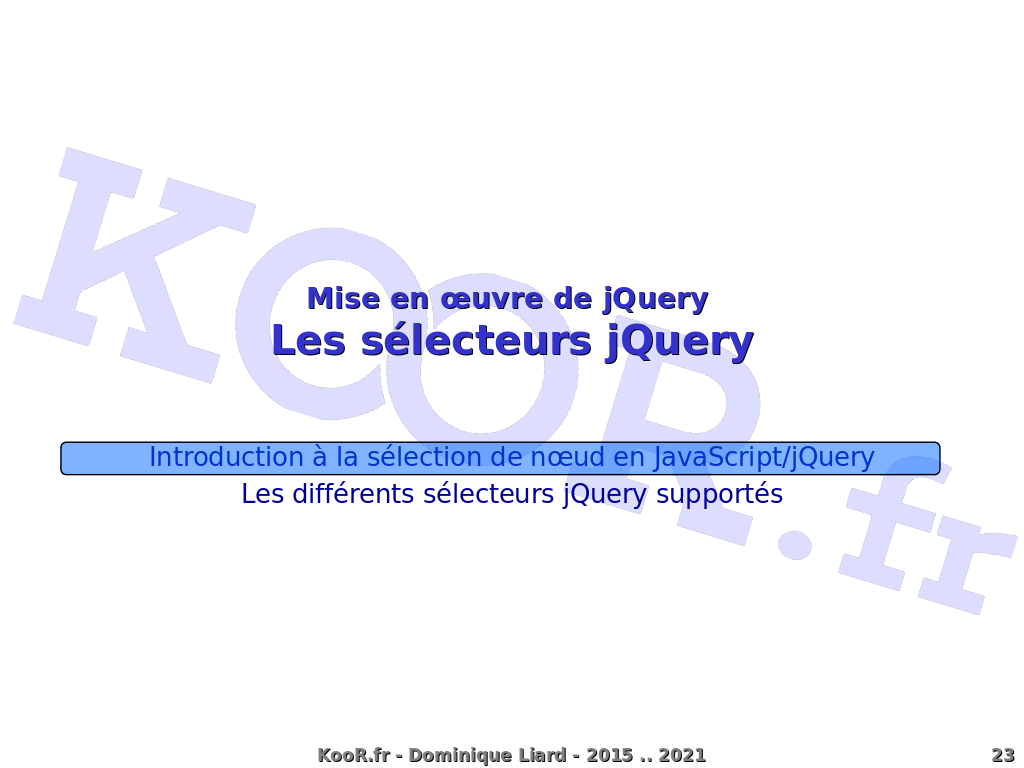 Mise en ?uvre de jQuery Les sélecteurs jQuery Introduction à la sélection de n?ud en JavaScript/jQuery Les différents sélecteurs jQuery supportés KooR.fr - Dominique Liard - 2015 .. 2021