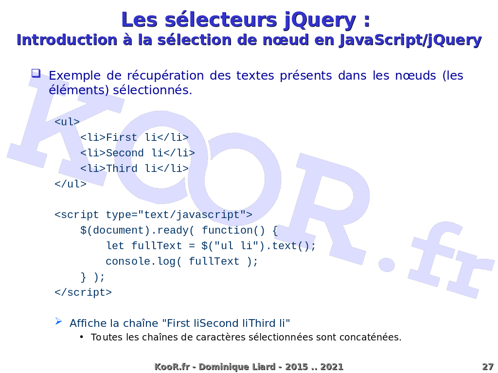 Les sélecteurs jQuery : Introduction à la sélection de n?ud en JavaScript/jQuery Exemple de récupération des textes présents dans les n?uds (les éléments) sélectionnés. <ul> <li>First li</li> <li>Second li</li> <li>Third li</li> </ul> <script type="text/javascript"> $(document).ready( function() { let fullText = $("ul li").text(); console.log( fullText ); } ); </script> Affiche la chaîne "First liSecond liThird li" Toutes les chaînes de caractères sélectionnées sont concaténées. KooR.fr - Dominique Liard - 2015 .. 2021