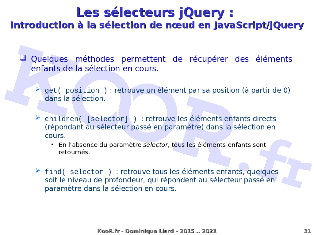 Les sélecteurs jQuery : Introduction à la sélection de n?ud en JavaScript/jQuery Quelques méthodes permettent de récupérer des éléments enfants de la sélection en cours. get( position ) : retrouve un élément par sa position (à partir de 0) dans la sélection. children( [selector] ) : retrouve les éléments enfants directs (répondant au sélecteur passé en paramètre) dans la sélection en cours. En l'absence du paramètre selector, tous les éléments enfants sont retournés. find( selector ) : retrouve tous les éléments enfants, quelques soit le niveau de profondeur, qui répondent au sélecteur passé en paramètre dans la sélection en cours. KooR.fr - Dominique Liard - 2015 .. 2021