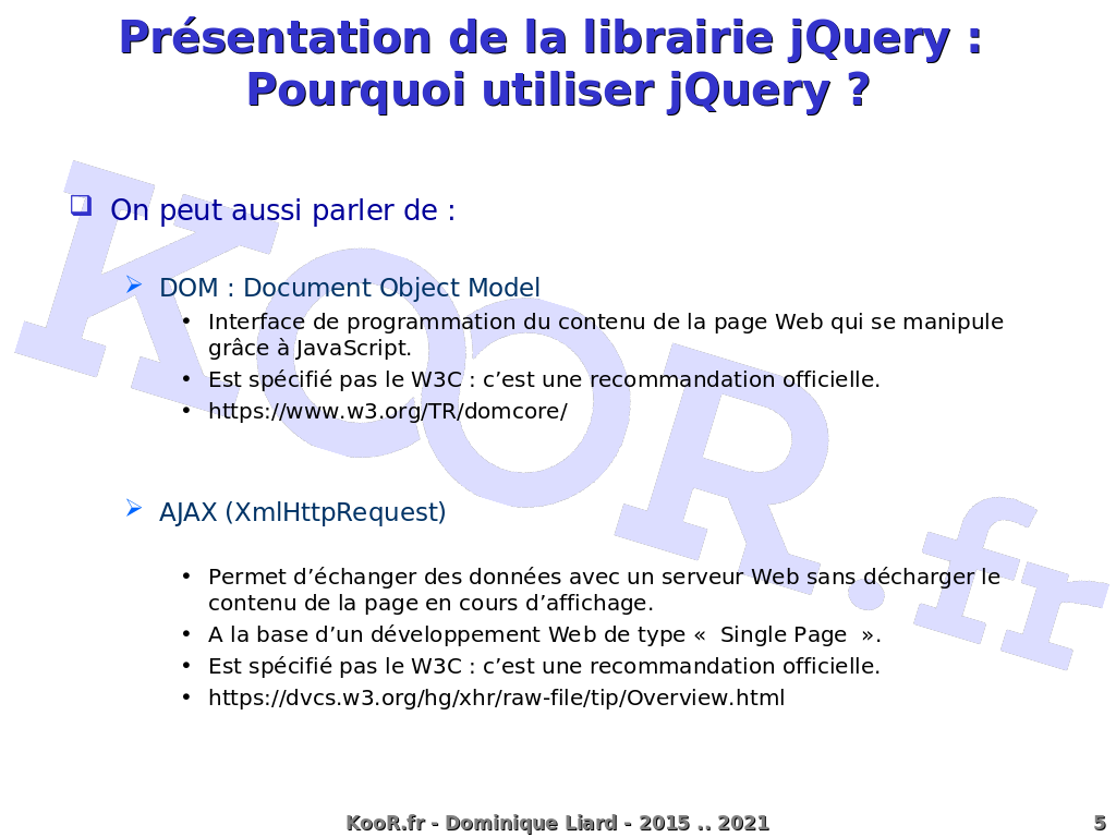 Présentation de la librairie jQuery : Pourquoi utiliser jQuery ? On peut aussi parler de : DOM : Document Object Model Interface de programmation du contenu de la page Web qui se manipule grâce à JavaScript. Est spécifié pas le W3C : c'est une recommandation officielle. https://www.w3.org/TR/domcore/ AJAX (XmlHttpRequest) Permet d'échanger des données avec un serveur Web sans décharger le contenu de la page en cours d'affichage. A la base d'un développement Web de type « Single Page ». Est spécifié pas le W3C : c'est une recommandation officielle. https://dvcs.w3.org/hg/xhr/raw-file/tip/Overview.html KooR.fr - Dominique Liard - 2015 .. 2021