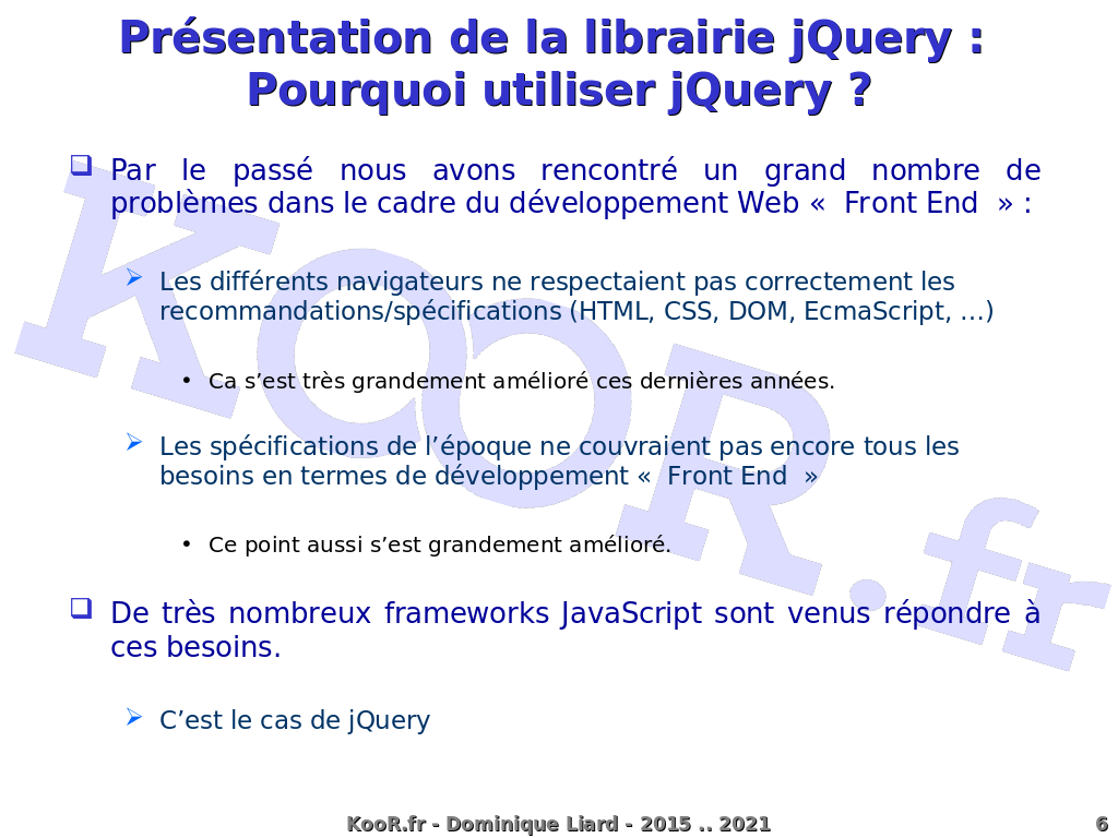 Présentation de la librairie jQuery : Pourquoi utiliser jQuery ? Par le passé nous avons rencontré un grand nombre de problèmes dans le cadre du développement Web « Front End » : Les différents navigateurs ne respectaient pas correctement les recommandations/spécifications (HTML, CSS, DOM, EcmaScript, ?) Ca s'est très grandement amélioré ces dernières années. Les spécifications de l'époque ne couvraient pas encore tous les besoins en termes de développement « Front End » Ce point aussi s'est grandement amélioré. De très nombreux frameworks JavaScript sont venus répondre à ces besoins. KooR.fr - Dominique Liard - 2015 .. 2021
