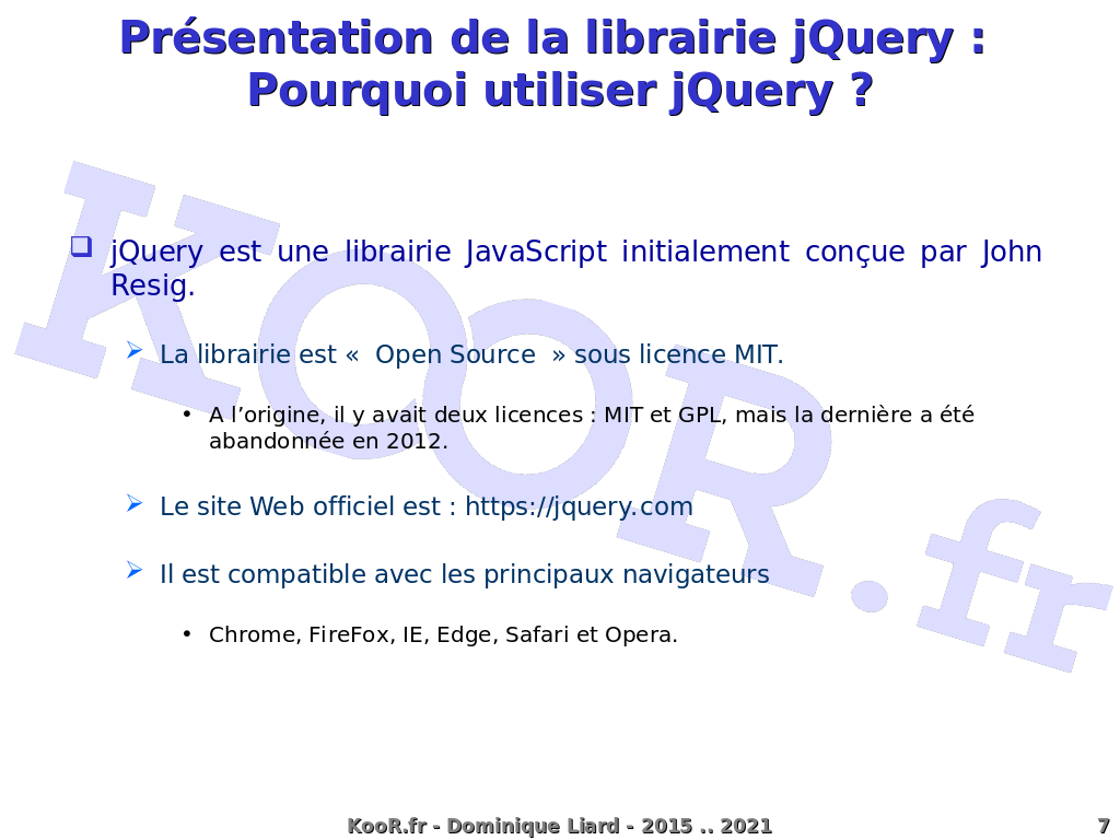 Présentation de la librairie jQuery : Pourquoi utiliser jQuery ? jQuery est une librairie JavaScript initialement conçue par John Resig. La librairie est « Open Source » sous licence MIT. A l'origine, il y avait deux licences : MIT et GPL, mais la dernière a été abandonnée en 2012. Le site Web officiel est : https://jquery.com Il est compatible avec les principaux navigateurs Chrome, FireFox, IE, Edge, Safari et Opera. KooR.fr - Dominique Liard - 2015 .. 2021