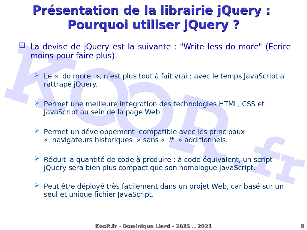 Présentation de la librairie jQuery : Pourquoi utiliser jQuery ? La devise de jQuery est la suivante : "Write less do more" (Écrire moins pour faire plus). Le « do more », n'est plus tout à fait vrai : avec le temps JavaScript a rattrapé jQuery. Permet une meilleure intégration des technologies HTML, CSS et JavaScript au sein de la page Web. Permet un développement compatible avec les principaux « navigateurs historiques » sans « if » additionnels. Réduit la quantité de code à produire : à code équivalent, un script jQuery sera bien plus compact que son homologue JavaScript. Peut être déployé très facilement dans un projet Web, car basé sur un seul et unique fichier JavaScript. KooR.fr - Dominique Liard - 2015 .. 2021